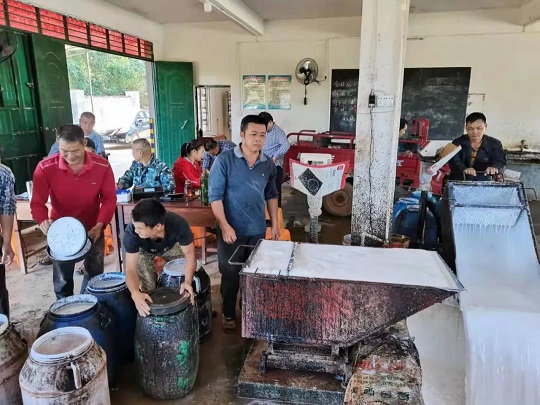 在龍江分公司雄英2隊收膠站,膠農們前來賣膠水。袁國華 攝